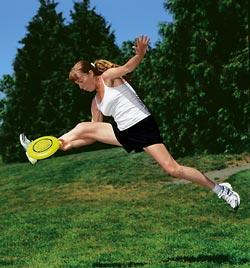 Instead, it curves and dances around a circle of players as they spin, squat, kneel, somersault, kick, airbrush, nail-delay, chest roll, back roll and cajole the disc in an improvised "jam" session. Funny, funky contortions with even weirder names: "Spinning Flamingitis," where you stand on one leg like a flamingo, pirouette a couple times, then wrap your arm under and around a raised leg to catch the disc. "Bad Attitude," a backward standing split, foot lifted above shoulder, hand reaching behind ankle to snag rotating plastic. "Scarecrow," a blind catch, arm angled backward, head looking in the opposite direction