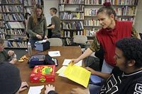 They have some resources available when they want them. The music room has a drum set, a keyboard, electric guitars. The quiet room has shelves filled with books. The computers have access to the Internet. There are games and art supplies and adults available to help students find answers to their questions. But staff (mainly adults who have children at the school) don't offer help unless asked.