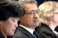 Seattle School District Superintendent Raj Manhas, center, and School Board President Cheryl Chow, left, react to Thursday's Supreme Court ruling during a press conference. (MIKE SIEGEL / THE SEATTLE TIMES)