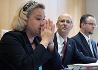 Kathleen Brose, one of the Seattle parents who challenged the use of race in assigning students to schools, appears at a Seattle news conference Thursday together with her attorney Harry Korrell, center, and Brian Hodges of the Pacific Legal Foundation. (KEN LAMBERT / THE SEATTLE TIMES)