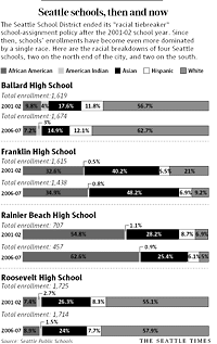 The tiebreaker, for example, benefited minority students at Ballard High. Ballard is 62.7 percent white today, compared with 56.7 percent in 2001-02. Franklin High, where the tiebreaker benefited white students, is 9.2 percent white today, compared with 21 percent in 2001-02.
