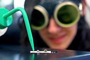 In a laboratory at North Seattle Community College, Robyn Severson peers through protective goggles at pieces of copper coated with a single layer of molecules that either repel or absorb water.
