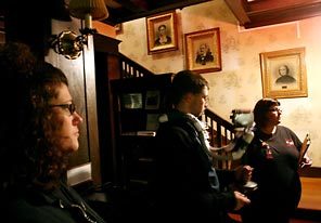 Inside the house, the team investigates a steep set of steps on which visitors and volunteers often trip. Some volunteers and visitors say have felt the sensation of being pushed down the stairwell, which is lined with hand-sketched portraits and faces of former owners, a museum volunteer says.