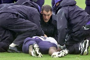 A medical team tends to Williams after a devastating hit in the UW-Stanford game in October 2000. Williams could respond only with his eyes. (STEVE RINGMAN / THE SEATTLE TIMES)